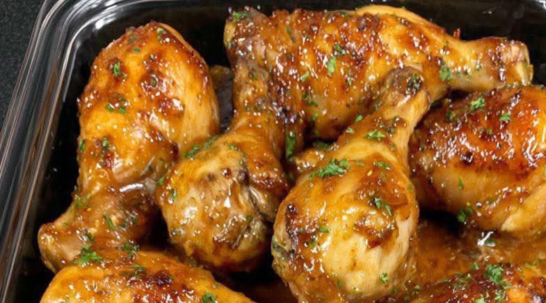 - Arrange the drumsticks in the baking dish and pour the honey garlic sauce over them, coating well.