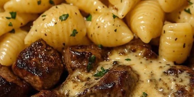 This dish features tender, caramelized steak bites coated in fragrant garlic butter and enveloped in a creamy Parmesan sauce. The contrast between the seared beef and silky sauce creates a luxurious yet comforting flavor profile.