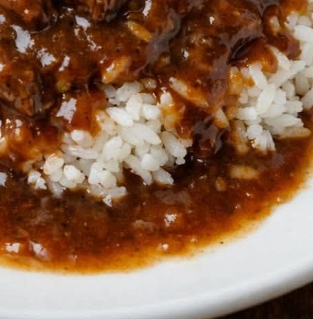 The dish delivers tender, slow-cooked beef coated in a thick, savory gravy that seeps into the rice beneath. Each bite is rich, warming, and deeply satisfying.